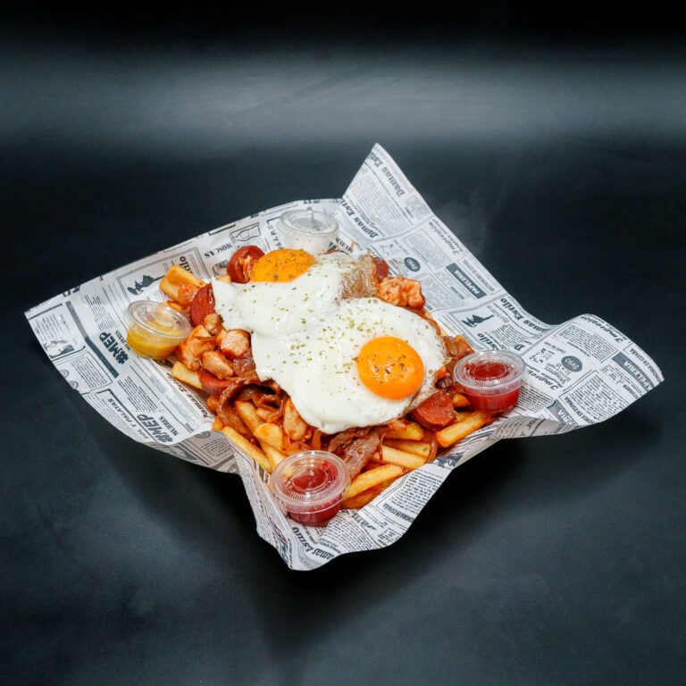 Carne, pollo, chorizo, cebolla caramelizada, 2 huevos fritos, papas fritas.